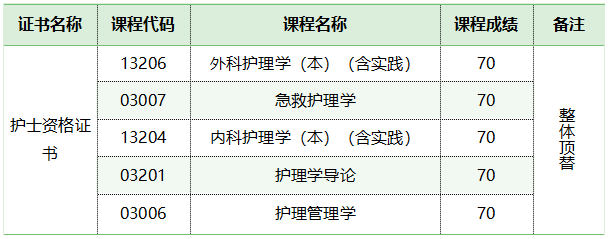 经甘肃省高等教育自学考试委员会印发《关于开展高等教育自学考试“学历证书+若干职业技能等级证书”试点工作的通知》(甘考委发〔2023〕3号),畅通学历证书和职业技能等级证书之间学习成果得到认定和转换,即兰州大学应用型(1+X项目)护理学专业取得护士资格证书者,可申请免考指定课程,免考课程如下: