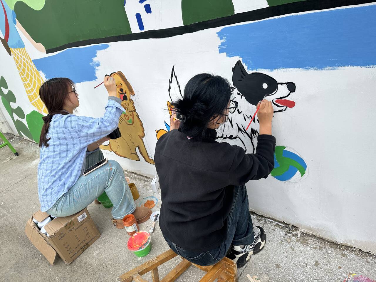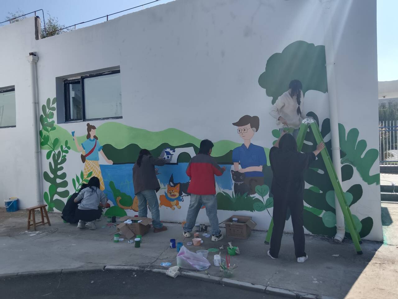 近日,农林科技学院举办了一场别开生面的彩绘壁画活动。活动中,学生们将动物、人物、植物形象巧妙融入墙面,采用鲜艳温暖的色调,营造出阳光温馨的校园氛围,展现了自然和谐的校园环境。这些壁画不仅提升了宠物医院外墙的视觉效果,更为宠物和主人打造了一个温馨、安全、互动性强的空间。