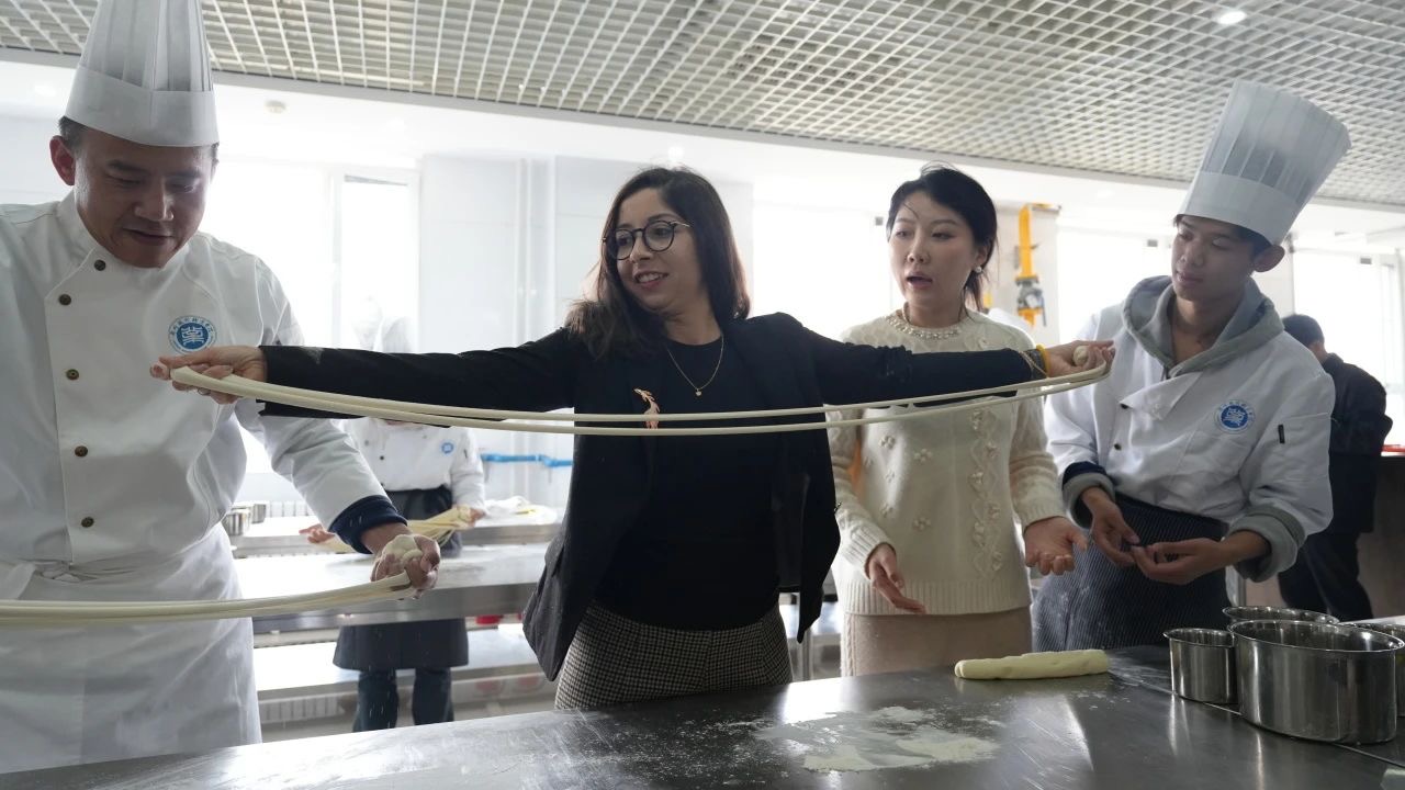 随后,代表团走进了学院财经商贸分院的烹饪课堂,看到烹饪专业的学生正在练习烹饪基本功,从刀工到翻炒,一举一动尽显专业素养,领略到传统烹饪技艺的魅力,也感受到了中国饮食文化的烟火气息。在这里,代表团还了解到兰州牛肉面的制作工艺。专业教师向代表团详细介绍了牛肉面的传统工艺后,现场演示了拉面制作的全过程,邀请代表团参与体验制作,品尝美味牛肉拉面。这使得代表团深刻领略了中国饮食文化的魅力,也感受到甘肃兰州独特的文化韵味。