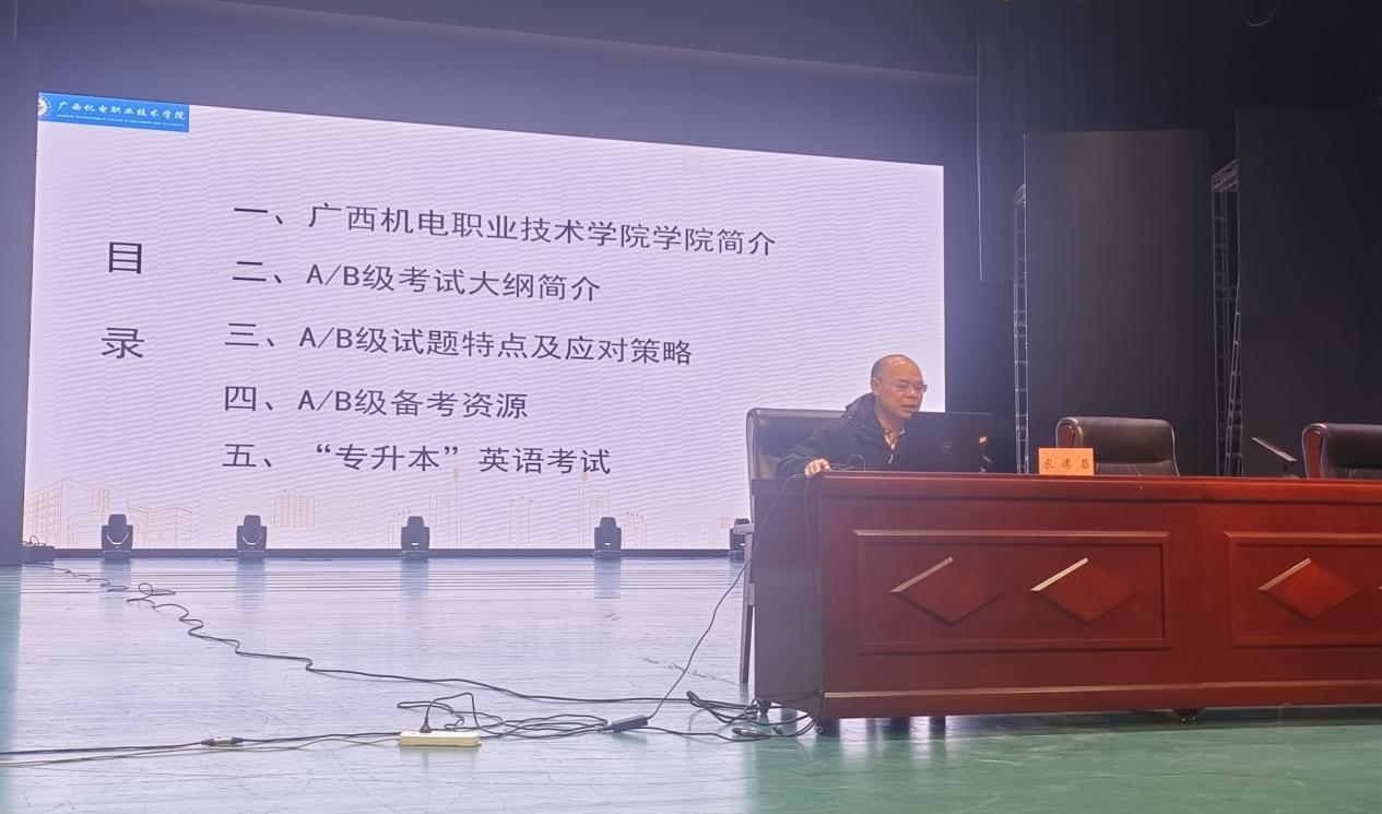 学院教务处公共教学部精心策划,在图书馆1楼剧场组织了覆盖1730名学生的大规模培训。广西机电职业技术学院的农德昌副教授受邀前来,为学生作《高等学校英语应用能力考试(A/B级)备考方法略谈》的专题讲座。讲座内容全面,细致入微,不仅涵盖了听力、阅读、写作、翻译等考试各个环节,还深入讲解了词汇语法等基础知识,为学生备考提供了有力的支持。
