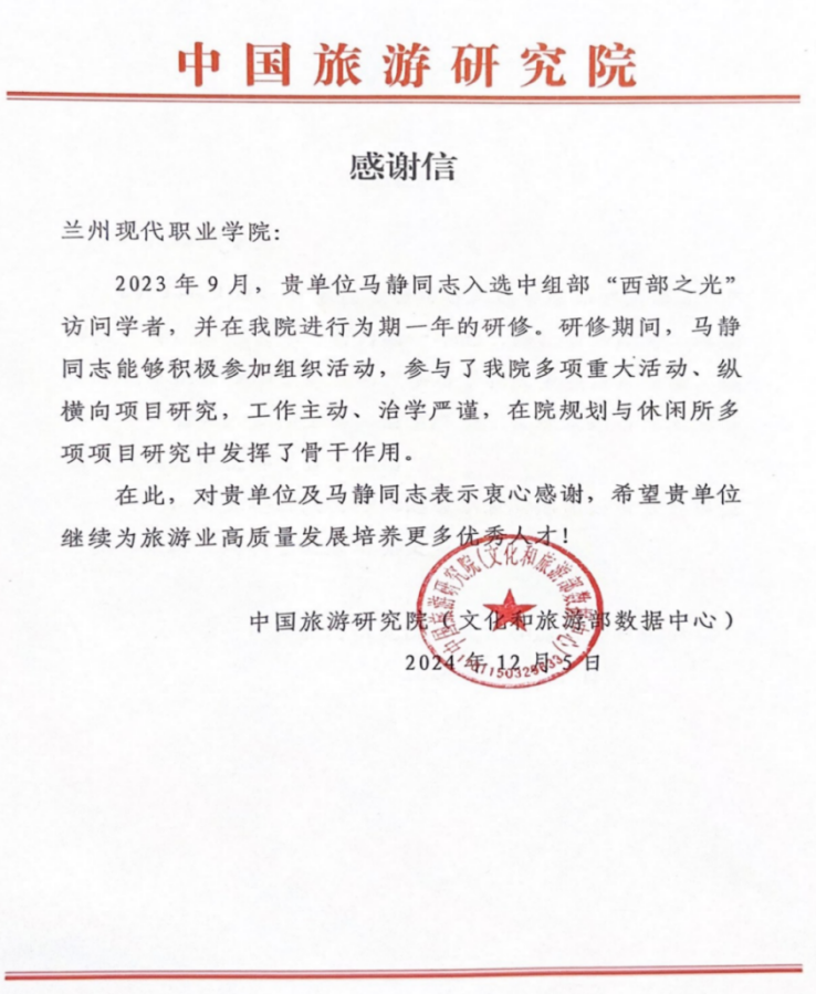 近日,beat365中文官方网站收到了一封来自中国旅游研究院(文化和旅游部数据中心)的感谢信。beat365旅游航空学院教师马静同志于2023年入选中组部、教育部、科技部、中国科学院“西部之光”访问学者,访学期间表现出色,受到访学单位高度赞扬。
