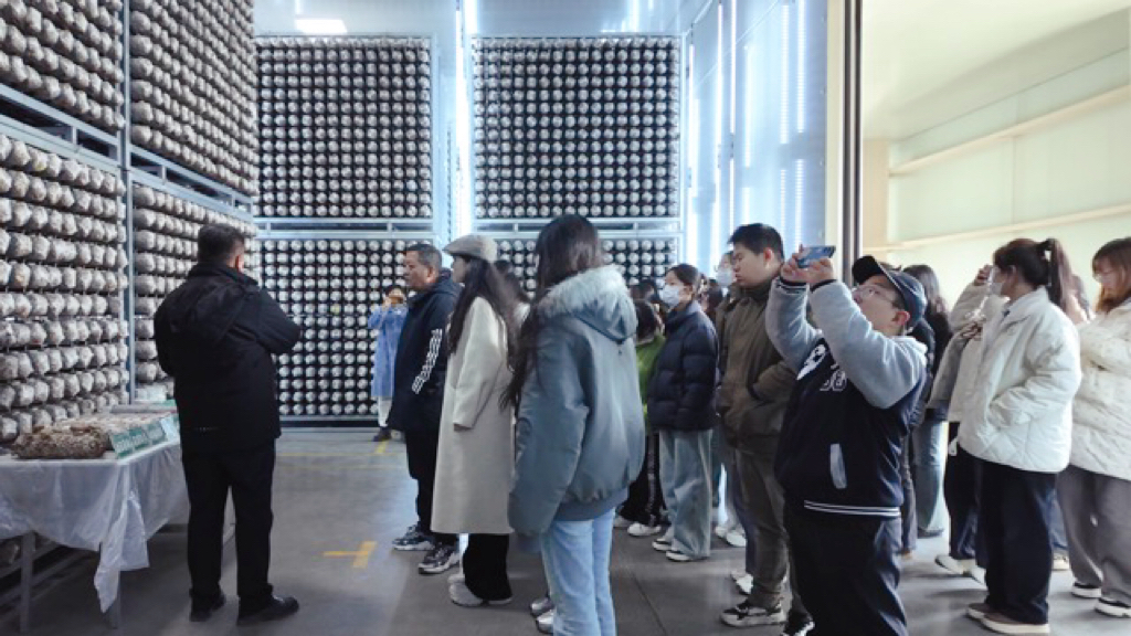 公司工作人员张涛带领同学们先后参观菌棒加工车间、种植大棚和双创基地食用菌种植基地,介绍食用菌菌棒生产流程、生产规模及质量控制,和同学们交流食用菌的分类、食用菌的生产、种植条件和培育技术等。同学们通过深入参观和学习,对秦东农投从科学种植、提高技术含量入手,做优做强食用菌产业,提升产品市场竞争力的过程有了深入了解,并围绕销售布局、运营管理、供需关系等方面积极提问,工作人员耐心解答,现场氛围热烈。