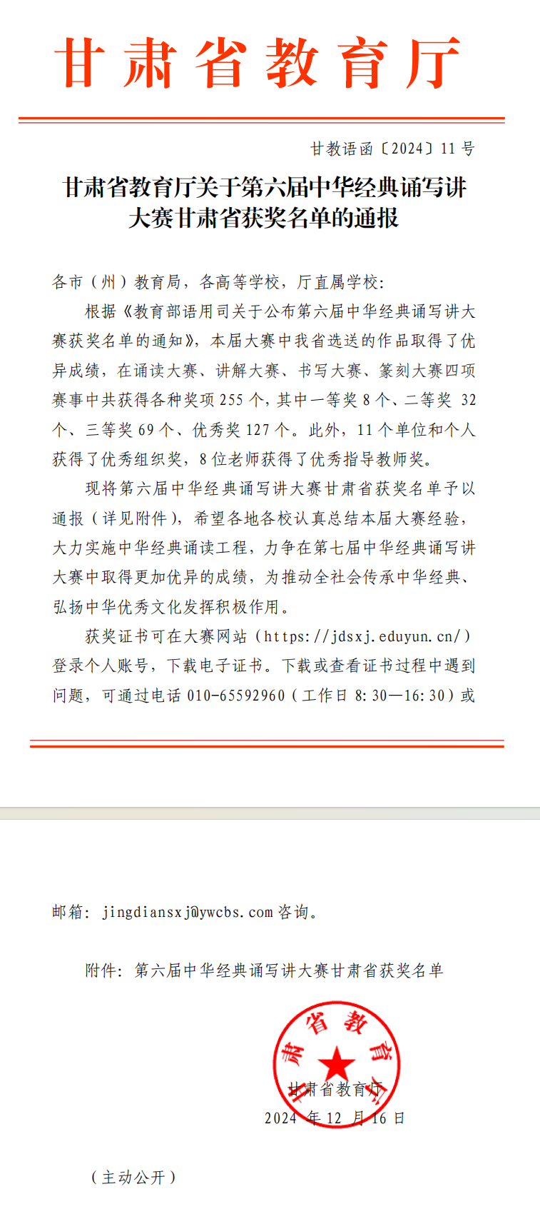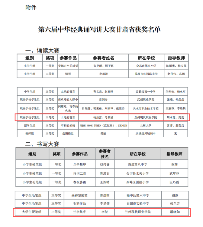 近日,中华经典诵写讲大赛组委会公布了第六届中华经典诵写讲大赛获奖名单。beat365选送的作品取得了2项优异成绩,由周永花、龚蕊老师指导,杨淦富,马紫涵同学诵读的作品《土地的誓言》获得诵读大赛职业学校学生组全国三等奖;潘晓如老师指导,李玺同学书写的作品《兰亭集序》(硬笔)获得书写大赛大学生硬笔组全国三等奖。甘肃省教育厅特对本次获奖单位发文通报表扬。