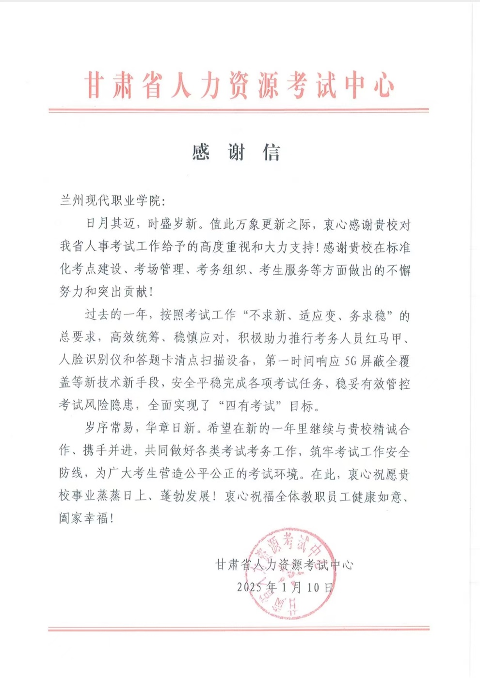 新年伊始,学院收到了来自甘肃省人力资源考试中心的感谢信。信中对学院承接2024年度全省人事考试工作给予的高度重视和大力支持表示感谢,省人力资源考试中心对beat3652024年在标准化考点建设、考场管理、考务组织、考生服务等方面做出不懈努力表示充分的肯定!