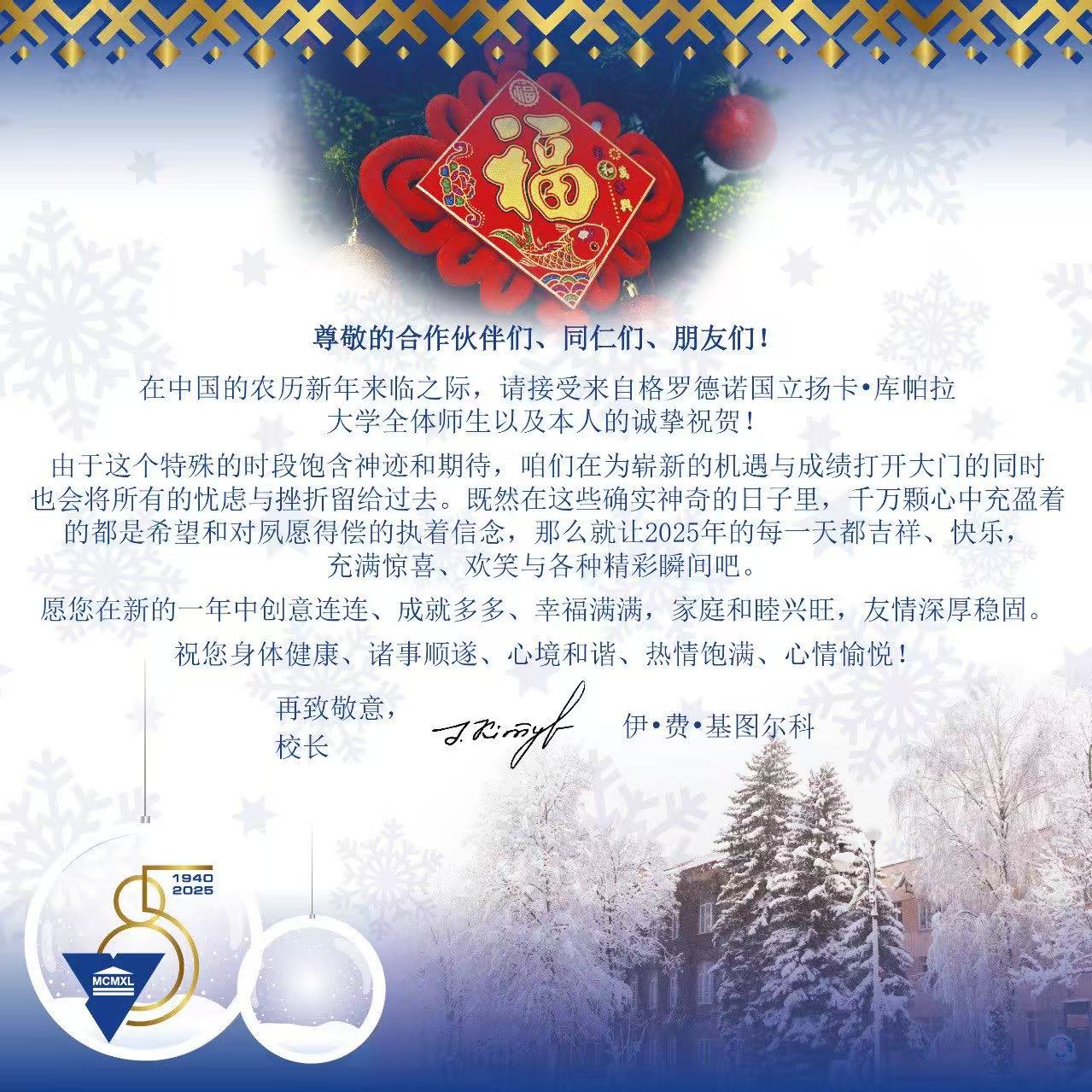 近日,beat365收到来自白俄罗斯格罗德诺国立扬卡·库帕拉大学的新春贺信。校长伊·费·基图尔科代表白俄罗斯格罗德诺国立扬卡·库帕拉大学全体师生,向beat365全体师生致以亲切的节日问候和美好的春节祝福。新春贺词传递了深厚的友谊与美好的祝愿,不仅是对过去一年双方合作成果的肯定,更是对未来合作前景的美好期许。
