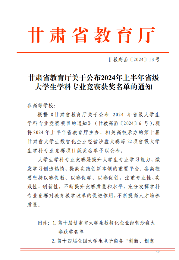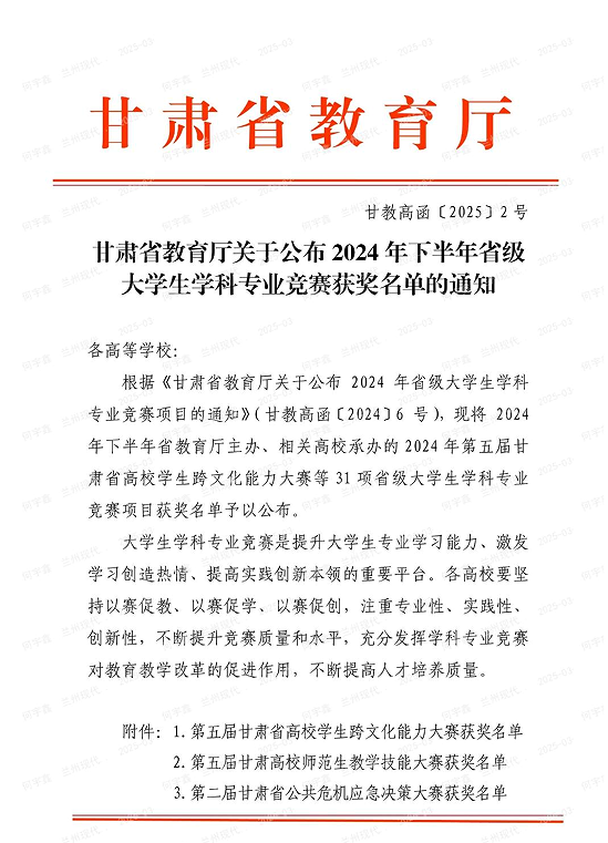 大学生学科专业竞赛是提升大学生专业学习能力、激发学习创造热情、提高实践创新本领的重要平台。2024年度,兰州现代职业学院在省级大学生学科专业竞赛中取得佳绩,在第十届甘肃省大学生数智化企业经营沙盘大赛、第十一届 “学创杯” 全国大学生创业综合模拟大赛甘肃赛区选拔赛、第二届甘肃省公共危机应急决策大赛、高教社杯全国大学生数学建模竞赛甘肃赛区选拔赛等赛事中,共获一等奖15项、二等奖14项、三等奖15项,14位老师荣获“优秀指导教师奖”。在第三届甘肃省大学生智能机器人创意竞赛、第三届甘肃省财务数智化大赛、第二届甘肃省公共危机应急决策大赛、第十二届全国大学生财务决策大赛甘肃赛区选拔赛中,学院获优秀组织奖。