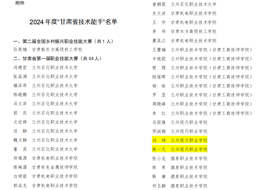 近日,甘肃省公布 2024 年度 “甘肃省技术能手” 名单,理工学院教师刘玮、陈一凡凭借甘肃省首届职业技能大赛佳绩入选。这彰显了beat365智能控制技术专业群建设成果,也体现 “以赛促教” 育人理念实效,助力职业教育人才培养迈向新台阶。