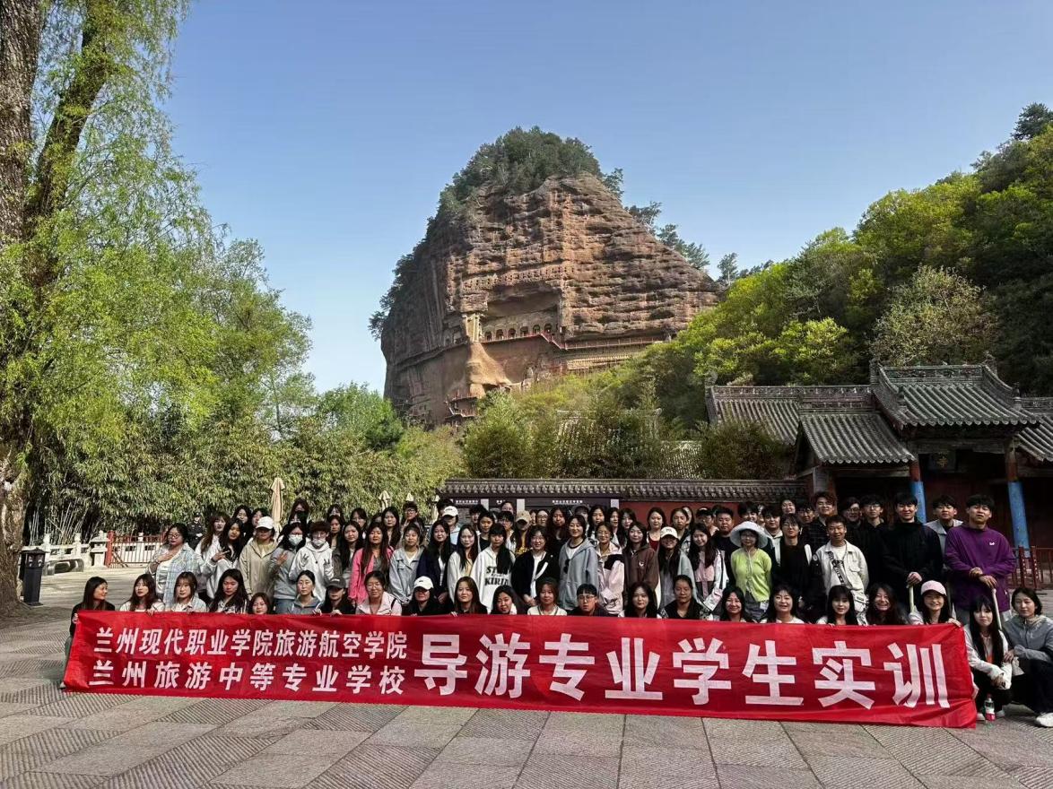4 月 15 日至 19 日,旅游航空学院组织 2023 级旅游管理、导游专业 93 名学生开展甘肃东南线实训。师生走进麦积山石窟、伏羲庙等多元场景,在金牌导游指导下,学生分组开展实地讲解训练,提升讲解技巧与临场应变能力。