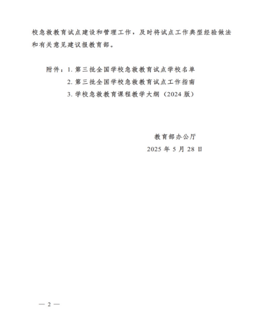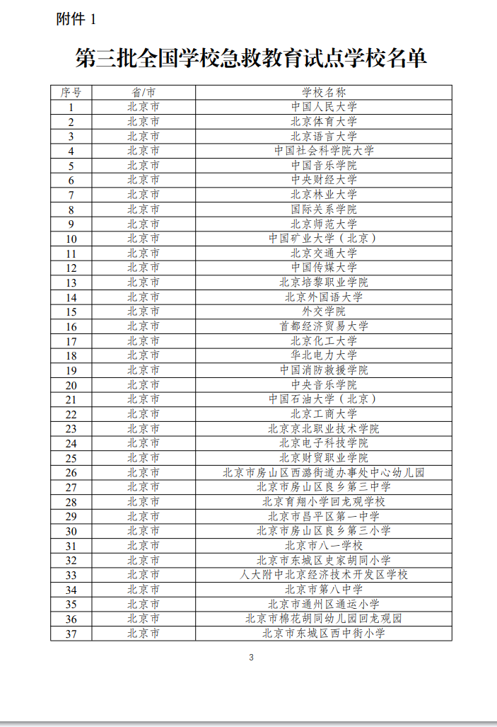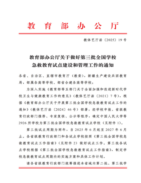 近日,教育部印发《关于做好第三批全国学校急救教育试点建设和管理工作的通知》(教体艺厅函〔2025〕19号),公布了第三批全国急救教育试点学校名单,我院成功入选。这是对学院多年来扎实推进急救教育工作、全面提升师生应急救护能力的充分肯定,更是推动学院急救教育事业迈向新高度的重要里程碑。