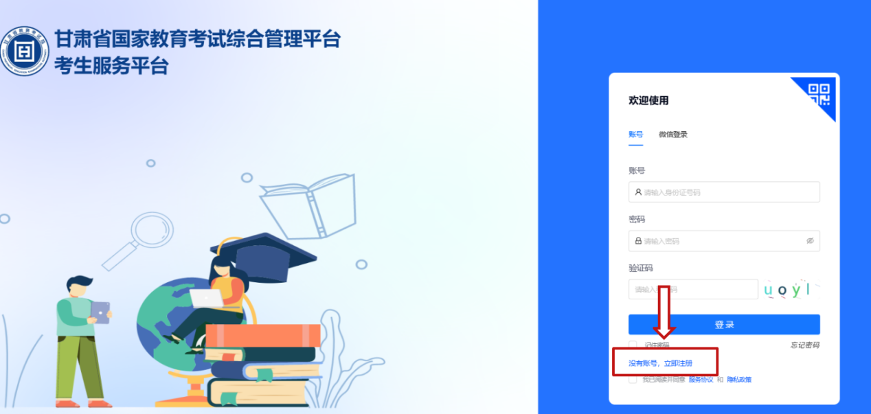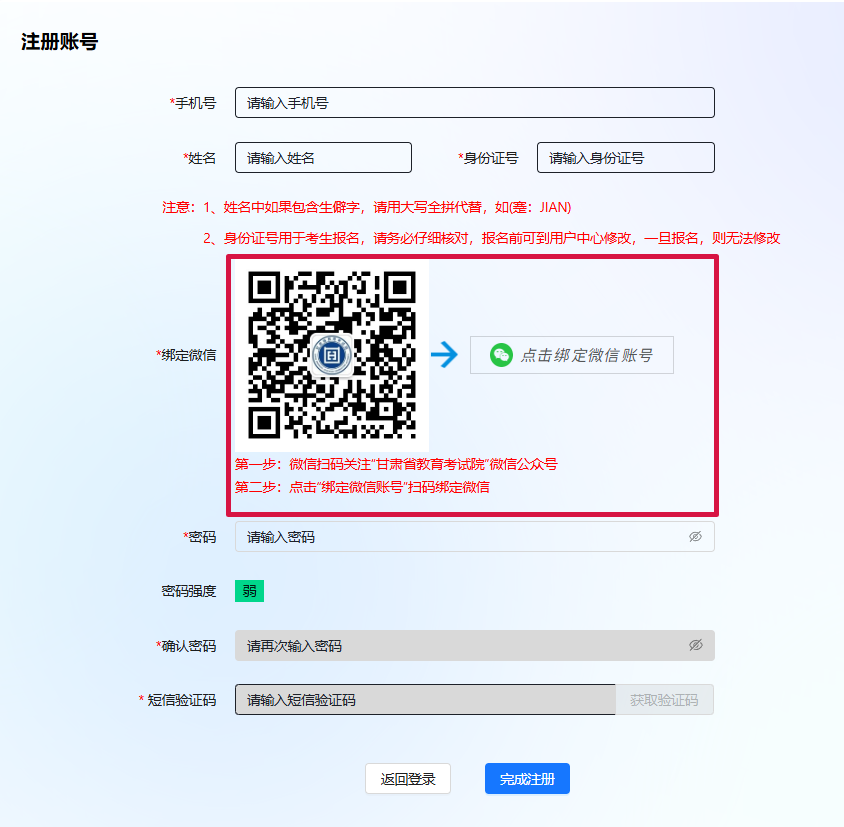 (二)注册时,用微信扫描下图中红色框内的二维码关注“甘肃省教育考试院”公众号,并且“点击绑定微信账号”
