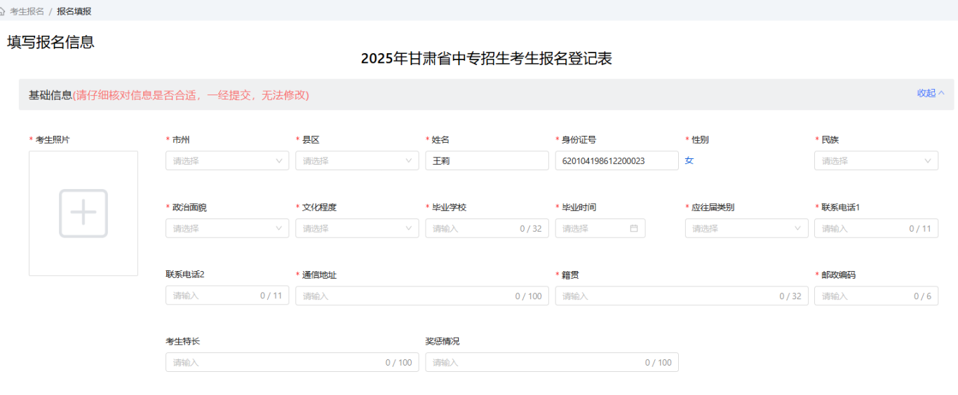 考生点击“开始填报”按钮,进入报名信息填报页面。