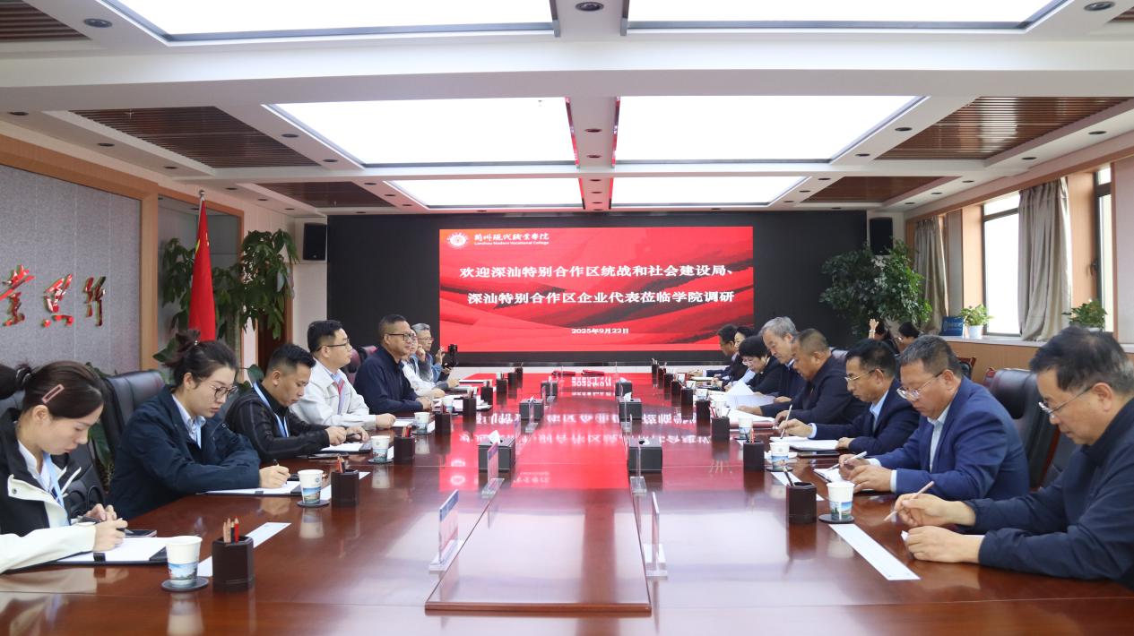 会上,学院领导对深汕特别合作区统战和社会建设局一行到来表示诚挚欢迎,并从发展历程、专业设置、产教融合等方面系统介绍学院近年来发展成效,还提出了政校企三方共同立足国家战略与区域发展,通过建立联络共享机制、强化产业资源对接、共建实训基地及订单班的四点合作建议。王昌稳局长则介绍深圳及合作区发展优势与来访目的,与会企业代表阐述此次合作意向。