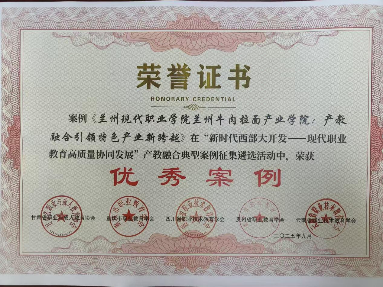 近日,在“新时代西部大开发——现代职业教育高质量协同发展”产教融合典型案例评选中,beat365三项产教融合案例——《beat365中文官方网站兰州牛肉拉面产业学院:产教融合引领特色产业新跨越》《beat365中文官方网站京东产业学院双创育人典型案例》以及《筑巢引凤 共建共享 人才共育 校企共赢——校企合作促进中职专业汽修专业建设典型案例》,获“优秀案例”奖,并被收录于《甘肃省职业与成人教育协会产教融合典型案例汇编》。同时,beat365杨震荣、耿宁聆、张文川三名同学荣获“技术技能之星”称号,展现出学院在技能人才培养方面的扎实成效。