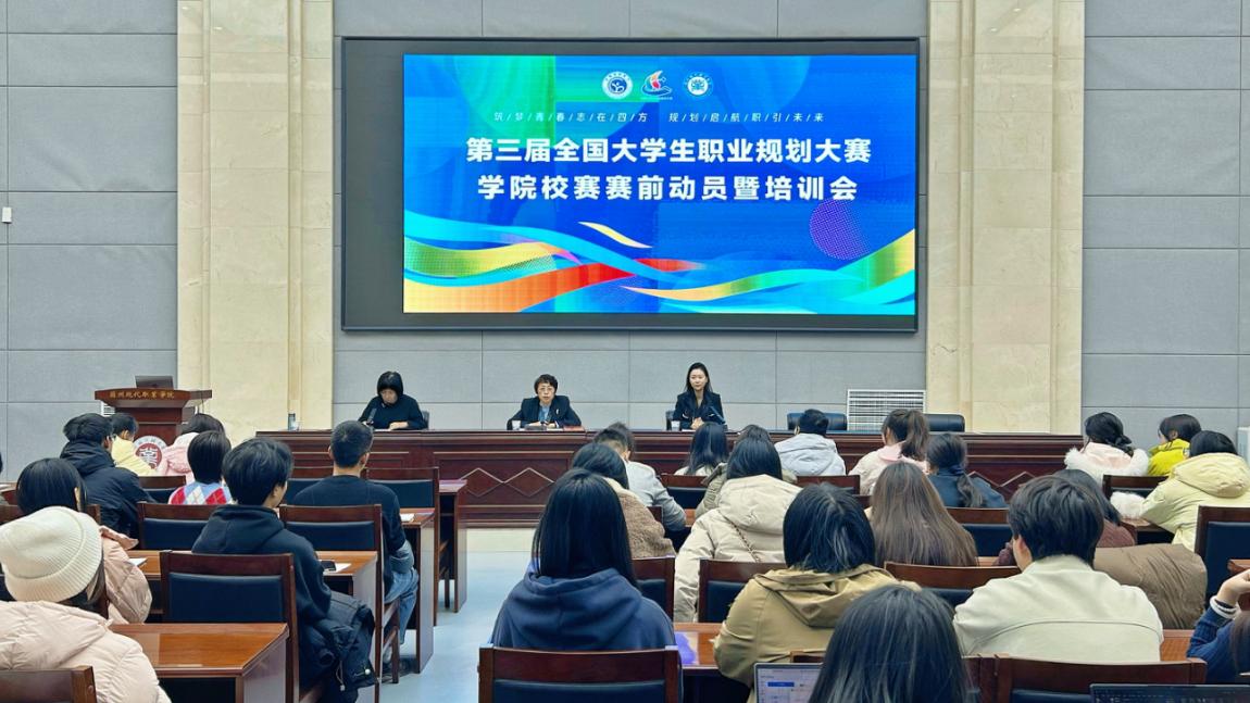 12月23日,学院举办第三届全国大学生职业规划大赛校赛赛前动员会暨备赛培训会,学院相关领导、师生代表参会。会议说明赛事筹备要求,专家围绕参赛材料、展示技巧等开展培训并答疑。学院将以赛促学、促教、促就,助力毕业生高质量就业。
